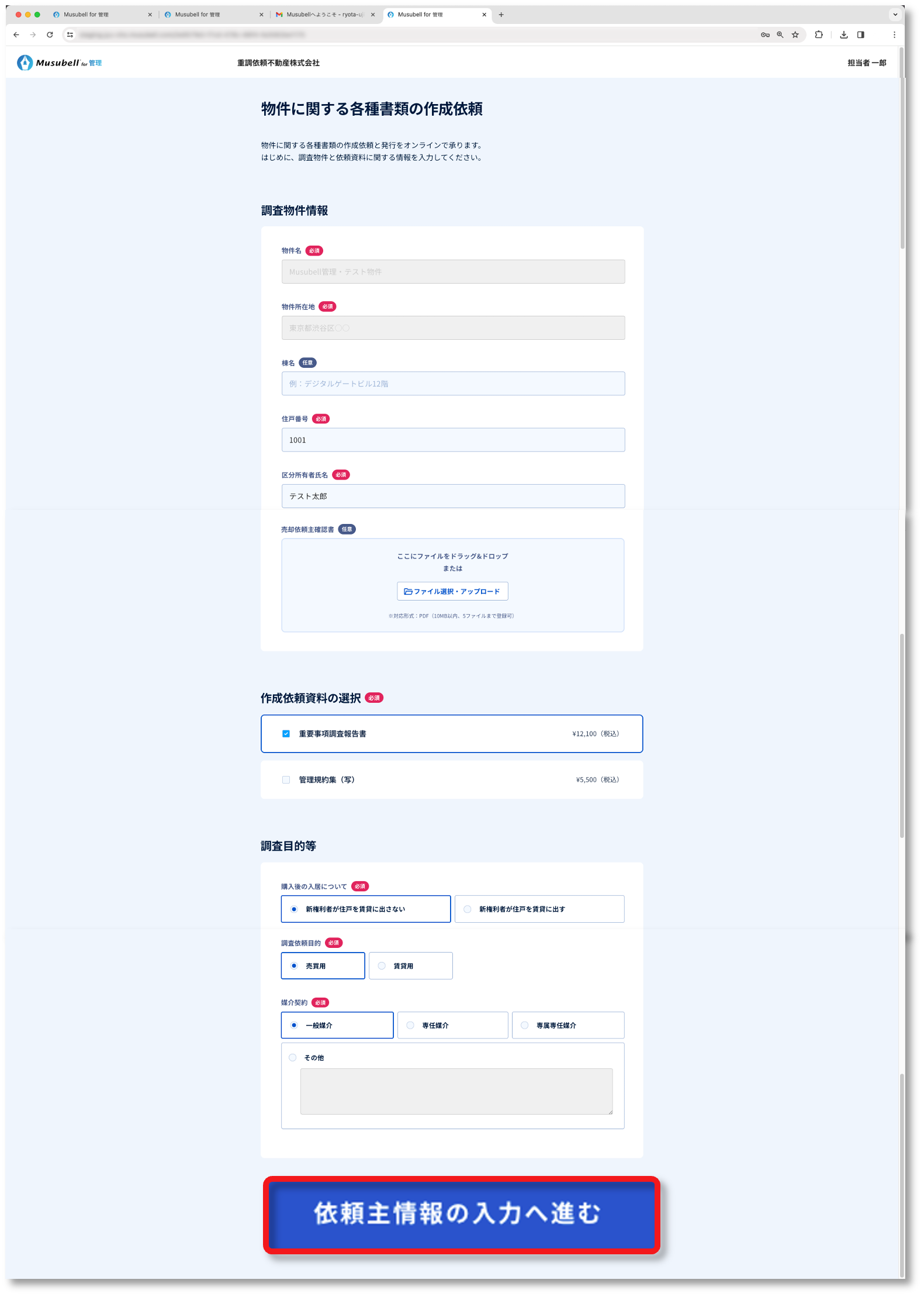 ・依頼のための必要項目に情報を入力のうえ、[依頼主情報の入力へ進む]を押します。