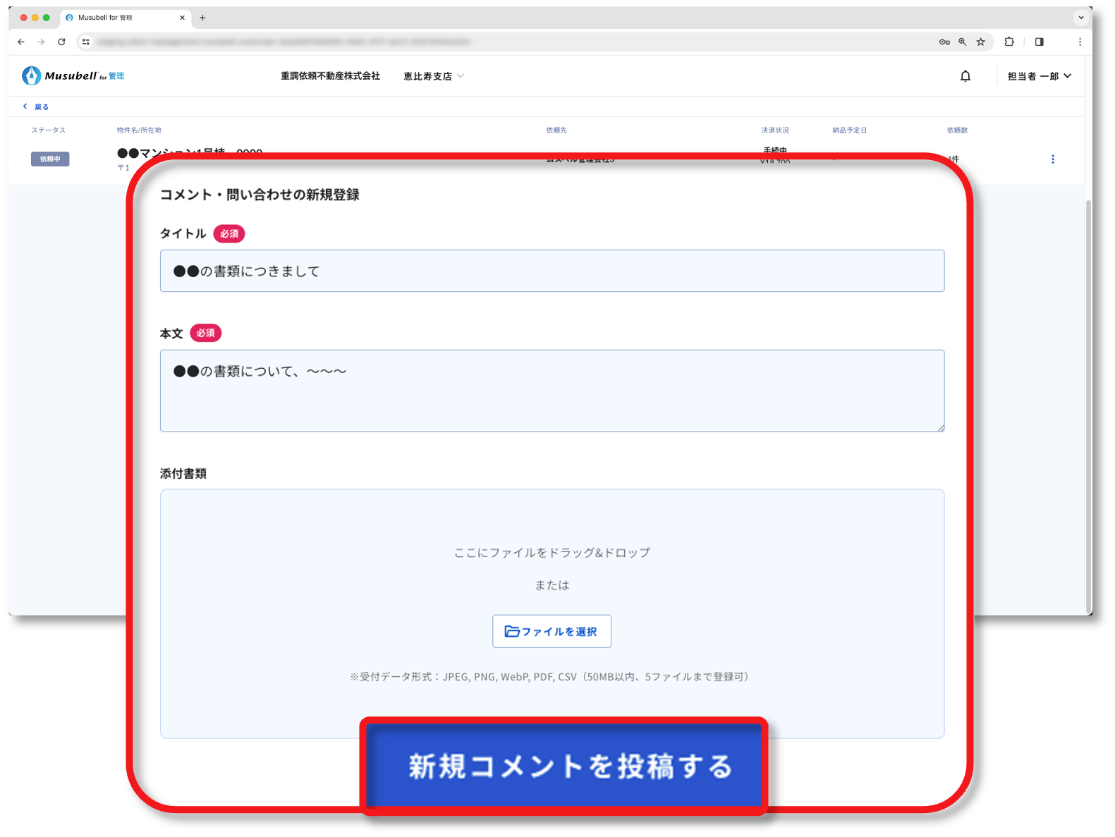 ・入力欄にコメントを記入のうえ[新規コメントを投稿する]を押すと管理会社に届きます。